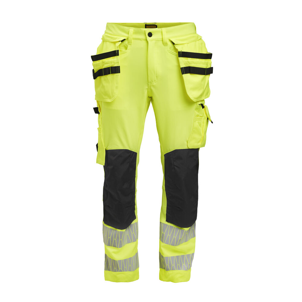 Comfortabele Hi-Vis werkbroek van 4-way stretch met delen van hoogwaardig geweven materiaal bij de enkel, beenzakken en holsterzakken. Afritsbare holsterzakken met extra vakken en een verstevigde binnenkant die in de voorzakken kunnen worden opgeborgen. De broek is voorzien van een comfortabele tailleband met stretch. De broek heeft paspelzakken op de achterzijde. Afgewerkt met extra riemlussen bij de grootste maten, een hamerlus en een liniaalzak met meszak. De zak op het been heeft een afgedekte ritssluiting, een ID-kaartzakje en een telefoonzakje. De voorgevormde knieën hebben kniebeschermerzakken van duurzaam polyamide. De kniestukken kunnen op twee verschillende hoogtes geplaatst worden om de beste positie voor optimale bescherming te garanderen. De reflecterende strips zijn in Jobman-design. De achterzijde van de knie is voorzien van mesh voor ventilatie. Broek kan bij de zoom met 5 cm worden verlengd.