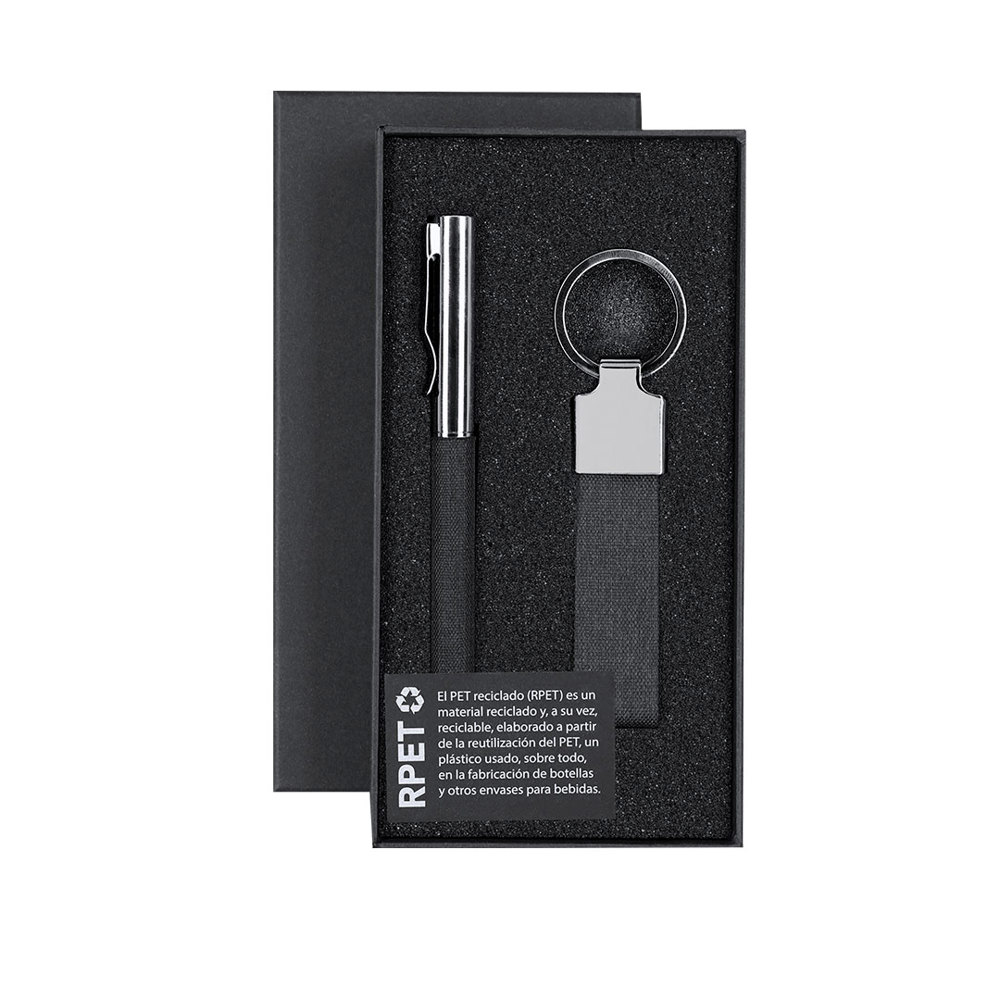 Elegante set in RPET met zwart-biten afwerking en metalen details. Bevat:-RPET balpen met zwart-biten afwerking en metalen details. Met draaimechanisme en blauwe inkt.-RPET sleutelhanger met zwart-biten afwerking en chromen accessoires.Ge presenteerd in een individuele zwarte doos. Inclusief zwarte interne kaart met RPET-label.Het RPET-materiaal wordt gemaakt van gerecycled plastic, om zo de hergebruik van plastic afval te bevorderen en te helpen bij de duurzaamheid van de planeet.