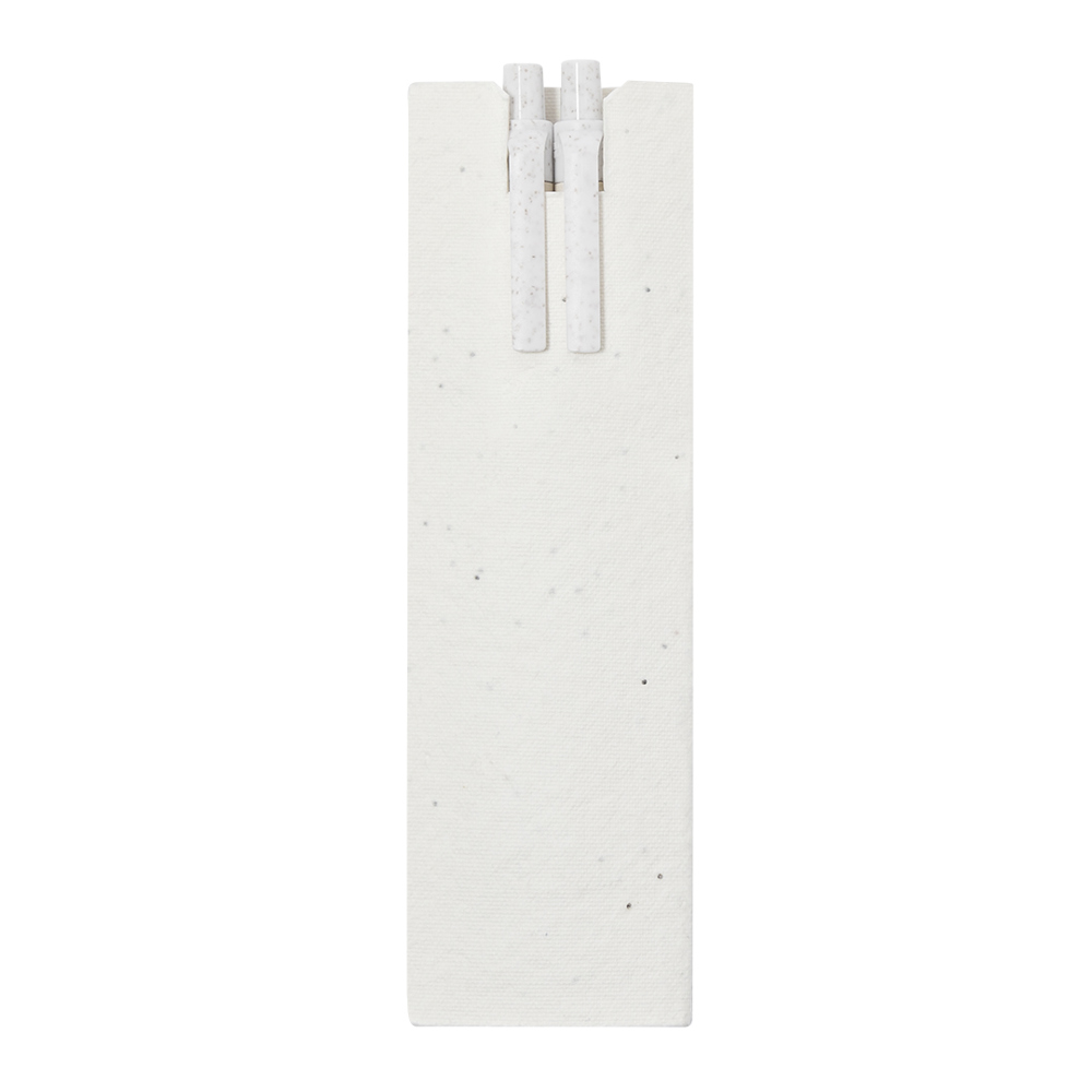 Set van balpen en eeuwige potlood gemaakt van gerecycleerde melkpakken, gepresenteerd in een papieren hoes met zaden. Balpen met blauwe inkt en potlood met eeuwige punt, om altijd dezelfde potlood te gebruiken zonder afval te genereren, beide met drukmechanisme en clip van Tarwegras, met gegraveerd merk. Met onderscheidingsmerk gerecycled melkpak op het lichaam. De hoes bevat petunia zaden, waardoor het aan het einde van zijn levensduur plantbaar papier wordt. Inclusief plantinstructies op de achterzijde van de hoes.Melkpakken bestaan voornamelijk uit karton en aluminium. Tijdens het recyclingproces worden de verschillende materialen van de verpakking gescheiden voor hergebruik, waardoor ze bijdragen aan de eindeloze circulaire economie. Dit materiaal staat bekend om zijn hoge recycleerbaarheid, evenals om zijn lichtheid en sterkte.Tarwegras bevordert het gebruik van natuurlijke grondstoffen, waardoor vervuilende emissies worden verminderd.