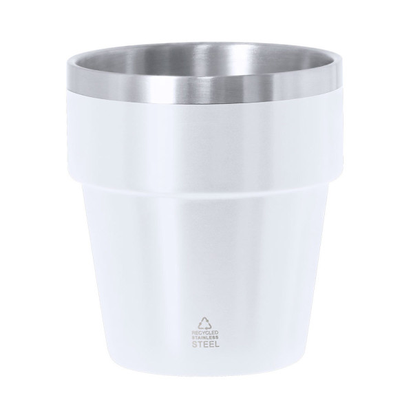 Thermosbeker gemaakt van gerecycled roestvrij staal met dubbele wand en een capaciteit van 250 ml. Afgewerkt in satijnglans en met rand en binnenkant in satijn roestvrij staal. Met logo van Gerecycled RVS.RVS is een van de meest gevraagde materialen en kan bijna overal worden aangetroffen, van dagelijkse gebruiksproducten tot grote constructies. Met talloze eigenschappen, waaronder duurzaamheid en een hoge mate van herbruikbaarheid, waarmee het een zeer gewaardeerde alternatief is in duurzaamheidsoplossingen. Correct behandeld, stelt het in staat om nieuwe bronnen van oneindig gebruik te verkrijgen.