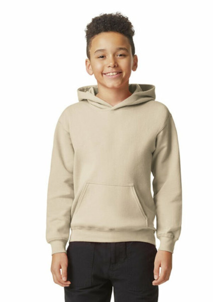 Gildan Softstyle Midweight Sweater met capuchon en buidelzak voor kinderen in de maten 104 t/m 176. Gemaakt van een zachte ringgesponnen katoenmix. De Softstyle Midweight Fleece heeft een geborstelde binnenkant met een 100% katoenen buitenkant, ideaal voor DTG-printen. Het voldoet aan de CPSIA-vereisten.