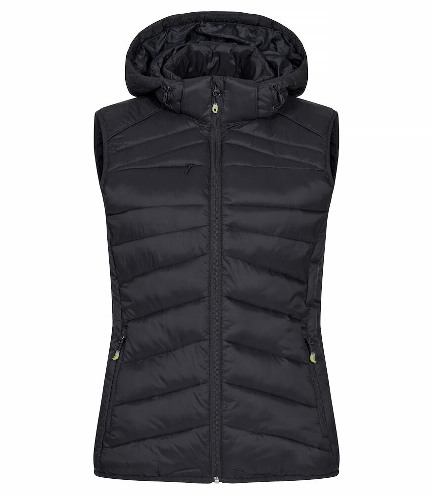 Een warm en toch lichtgewicht vest met donsachtige vulling gemaakt van 100% gerecycled polyamide. Voorzien van twee zijzakken en borstzak met rits en twee binnenzakken. De boord en armgaten zijn afgewerkt met een elastische band. Het damesmodel heeft een afneembare capuchon. Afgewerkt met doorvoer voor koptelefoon, ophanglusje in de nek en zipper puller in een contrasterende kleur.