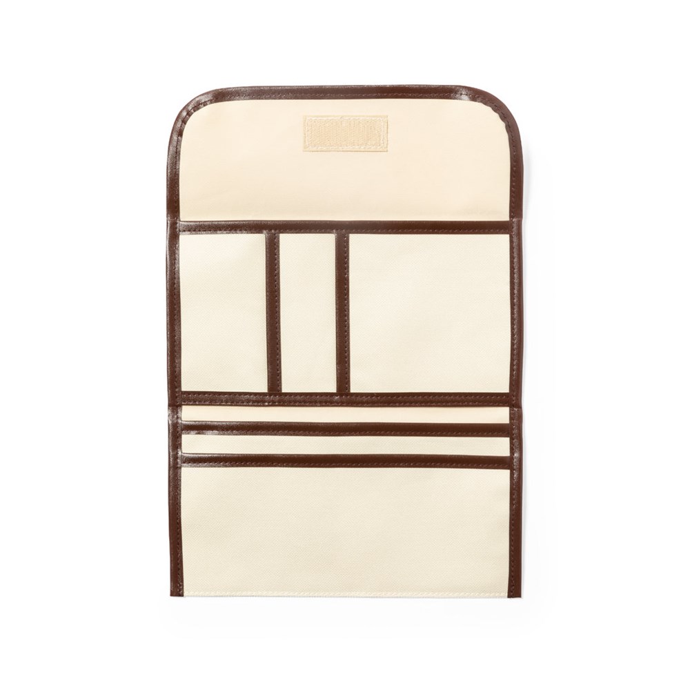 Reisdocumentenhouder van duurzaam 600D in naturel finish, met bruine PU lederen bies en verstevigingen. Flap met klittenbandsluiting en meerdere binnenvakken.