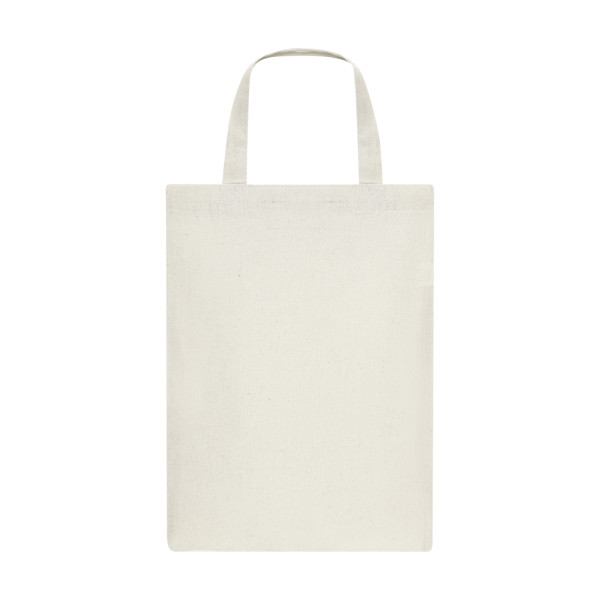 Tas van katoen, natuurlijke afwerking en 120g/m2. Gestikte afwerking, met korte verstevigde hengsels (30 x 2,5cm). Weerstand tot 5 kg in gewicht.