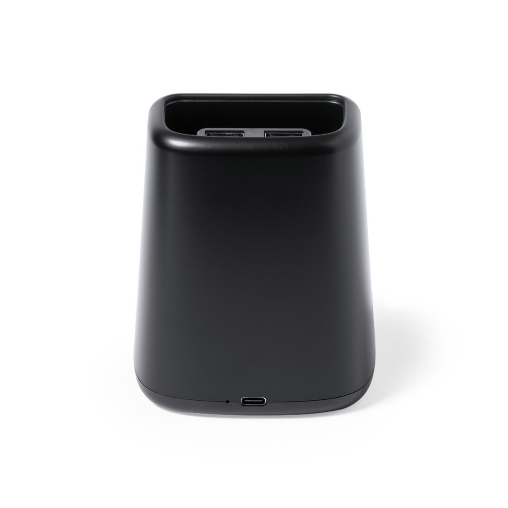 Multifunctionele penhouder met licht, speciaal ontworpen voor laser branding en backlighting van het logo.Met smartphonehouder en geïntegreerde 15W draadloze oplader, compatibel met apparaten uitgerust met Qi draadloze oplaadtechnologie. Inclusief 2 USB-uitgangen (5V DC 2A) en 150cm Type C oplaadkabel. Antislip basis en gepresenteerd in een individuele kraft design doos, met handleiding in het Engels en Spaans.Vervaardigd volgens RoHS-normen en in overeenstemming met de volgende veiligheidseisen:Beveiligingssysteem tegen oververhitting.Beveiligingssysteem tegen overbelasting.Blokkadesysteem om kortsluiting te voorkomen.