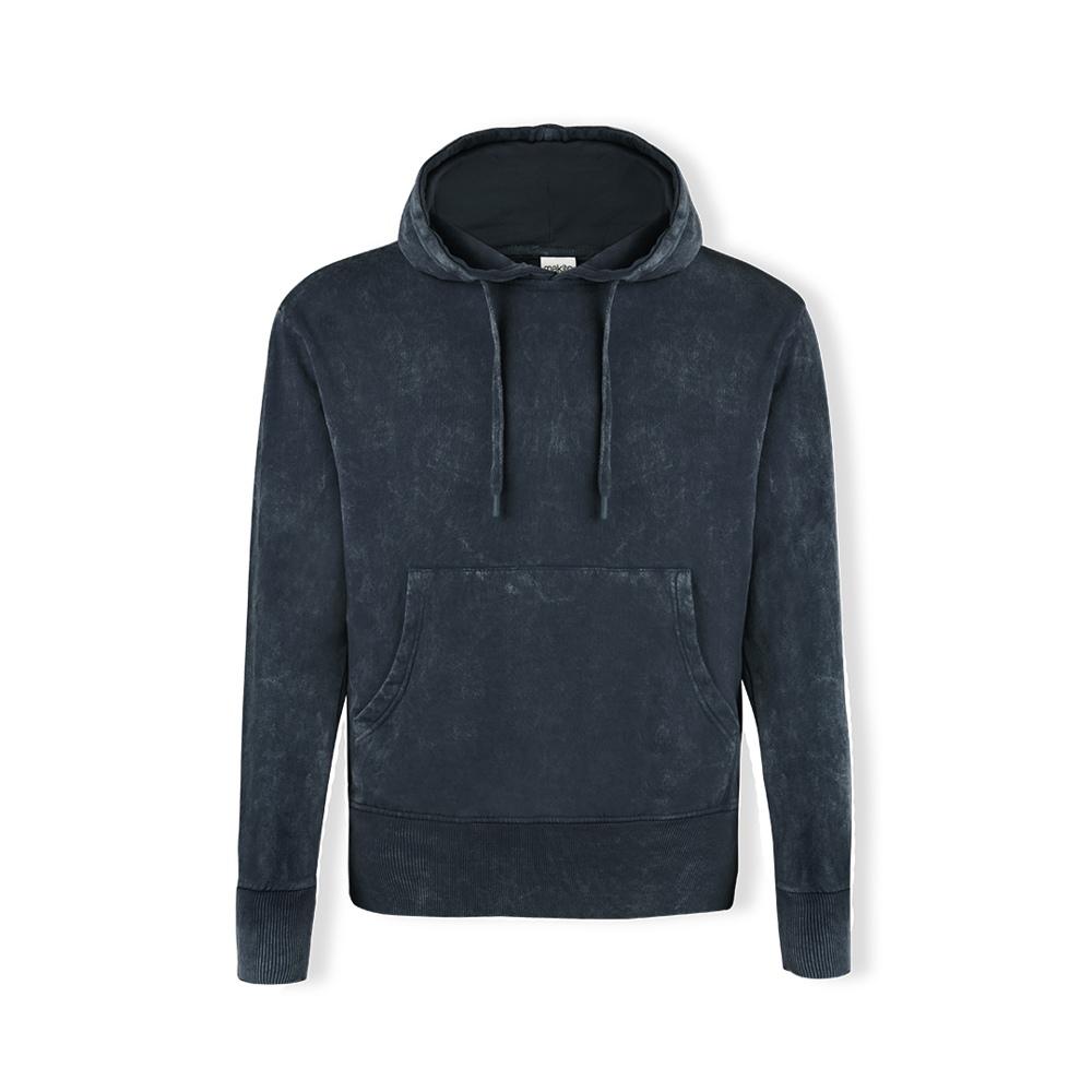 Uniseks sweatshirt met capuchon en gewassen jeanseffect, waardoor elk stuk uniek en onherhaalbaar is. Kangoeroezak, met extra brede elastische banden voor een perfecte pasvorm. Contrastkleur in de elastische banden van manchetten en zoom. Gemaakt van 100% gekamd katoen 280g/m2. Zacht aanvoelend en moderne snit, met verstelbare platte koorden en geborduurde oogjes, waarbij het gebruik van metaal wordt vermeden. Dubbele stiksels voor duurzaamheid en weerstand tegen intensieve slijtage. Eenvoudig verwijderbaar label en verkrijgbaar in de maten XS, S, M, L, XL en XXL.