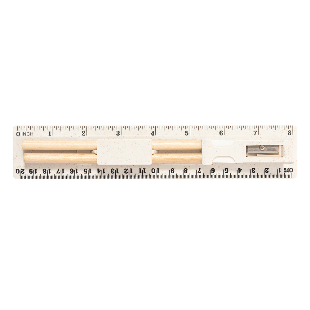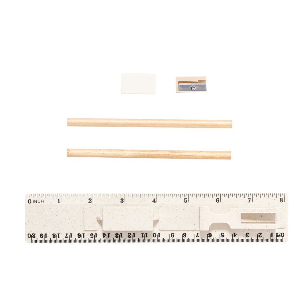 5-delige set gemaakt van tarwestro. Inclusief 2 houten potloden met zwarte stift en witte cilindervormige body; gum en puntenslijper. Gepresenteerd in een etui met liniaal van 20 cm/8 inch, met vakjes voor de verschillende elementen van de set. Individueel verpakt in een witte papieren zak. Tarwestro bevordert het gebruik van natuurlijke grondstoffen, waardoor de uitstoot van verontreinigende stoffen wordt verminderd.