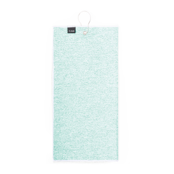 Golfhanddoek van RPET, absorberend en zacht met afmetingen van 40x60 cm. In het midden zit een versterkte ring en een karabijnhaak, beide van roestvrij staal. Met RPET-label.RPET-materiaal is gemaakt van gerecycled plastic, waardoor het hergebruik van plastic afval wordt bevorderd en de duurzaamheid van de planeet wordt geholpen.