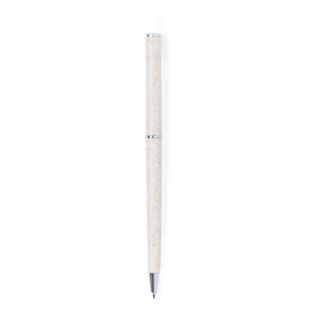 Balpen met tarwestro vat. Met metalen clip en verchroomde fittingen, draaimechanisme en blauwschrijvend. Met tarwestro logo en verkrijgbaar in een natuurkleur.
