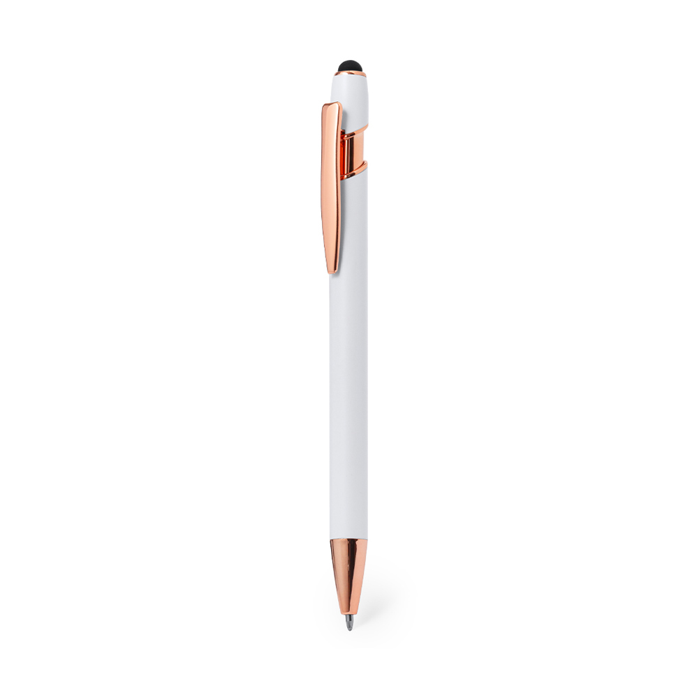 Uitstekende aluminium balpenwijzer met drukknopmechanisme. Duurzaam mat afgewerkt aluminium vat met decoratieve elementen in elegante koperen afwerking, met vat in een breed scala aan onderscheidende kleuren. Metalen clip en zwarte wijzer aan de bovenkant. In blauwe inkt.
