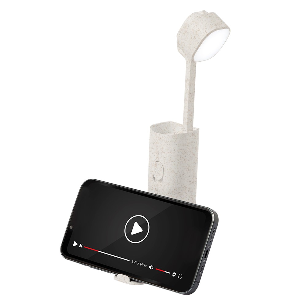 "Multifunctionele lamp gemaakt van tarwestro. Inclusief 12 LED's met instelbare intensiteit, opvouwbaar en in hoogte verstelbaar. Met houder voor mobiele apparaten en een antislipvoet, inclusief micro-USB-oplaadkabel. Handleiding beschikbaar in het Spaans en Engels, en gepresenteerd in een kraft-designdoos..Tarwestro bevordert het gebruik van natuurlijke grondstoffen, waardoor de uitstoot van verontreinigende stoffen wordt verminderd.Gefabriceerd volgens RoHS-normen en in overeenstemming met de volgende veiligheidseisen: Beveiligingssysteem tegen oververhitting. Beveiligingssysteem tegen overbelasting. Blokkeersysteem om kortsluiting te voorkomen."