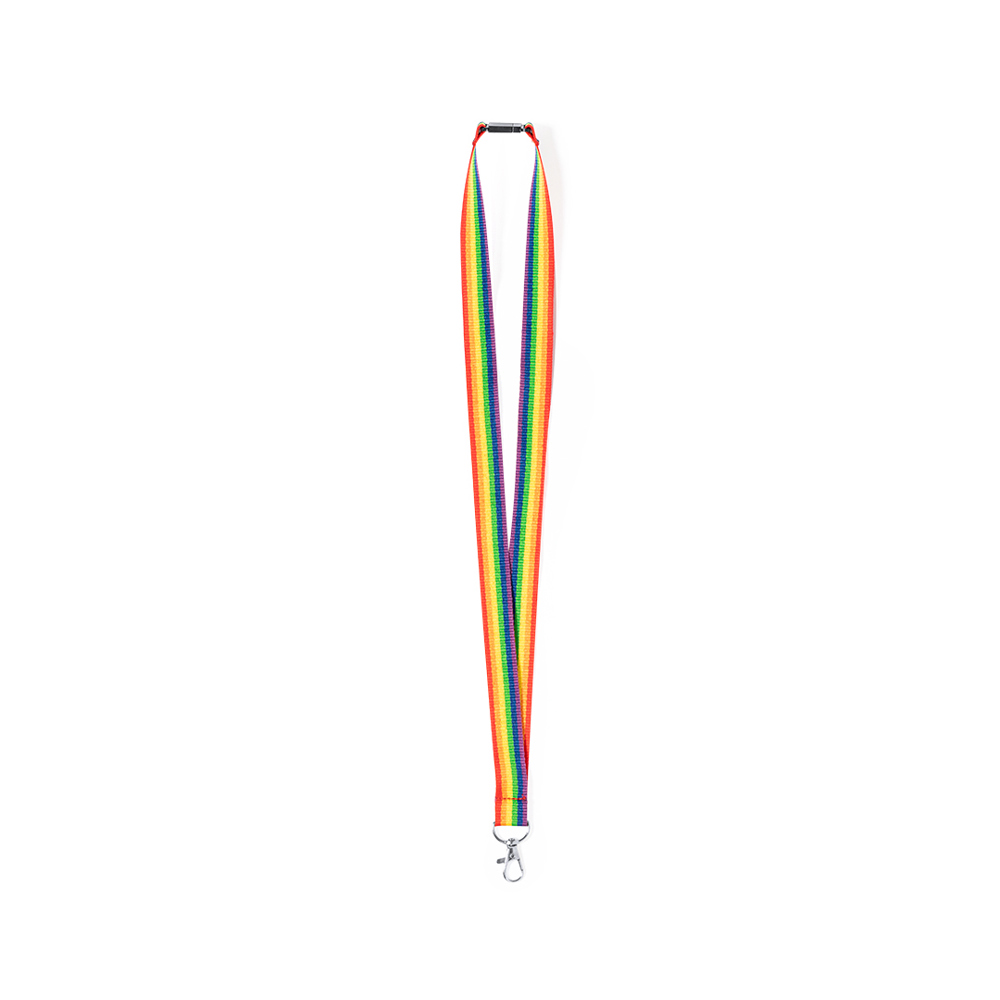 Veelkleurige regenboogsleutelkoord, gemaakt van zacht polyester. Met metalen draaihaak en nekveiligheidsbevestiging. Een echte trots van een sleutelkoord.