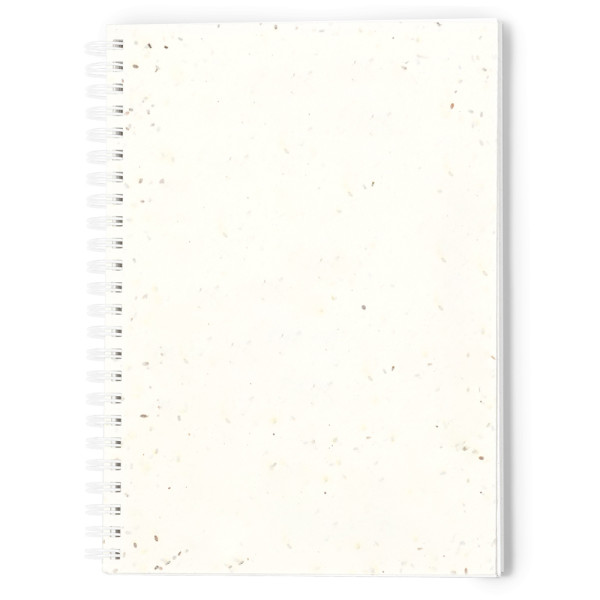 Ringband notitieboek met zachte kaft van zaadpapier. Met 80 effen witte vellen. De omslagen bevatten petuniazaadjes, waardoor het aan het einde van de levensduur beplantbaar papier is. Inclusief plantinstructies op de achterkant en gepresenteerd in een individuele zak van gerecycled papier..