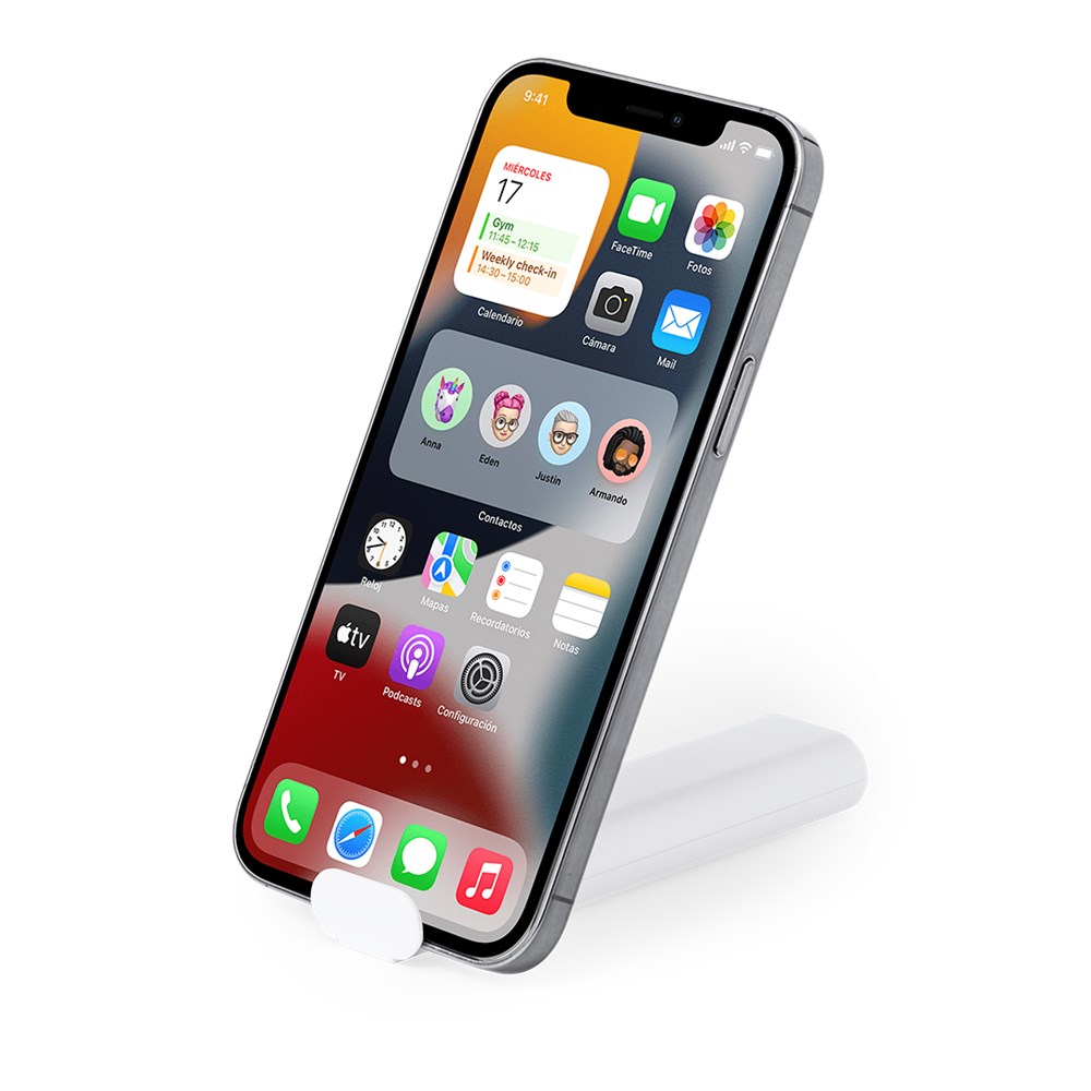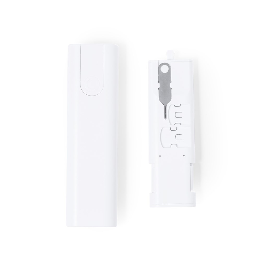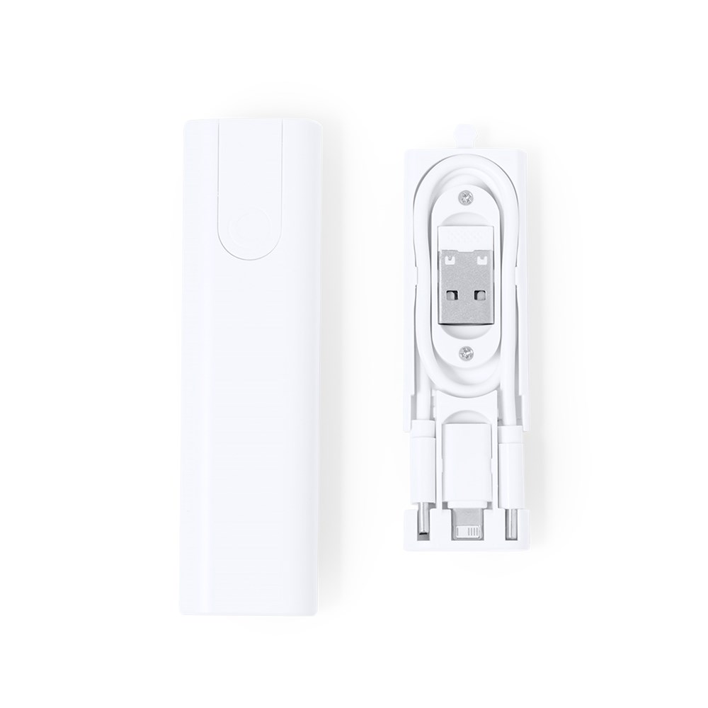 Complete set oplaadkabels. Verpakt in een compacte behuizing van resistent wit ABS, met geïntegreerde smartphonehouder. Inclusief oplader en synchronisatiekabel, geschikt voor dataoverdracht en meerdere aansluitingen: Micro USB, Type C en Lightning; SIM-uitwerper inbegrepen. 5V gelijkstroom 3A. Gepresenteerd in kraft-designdoos.