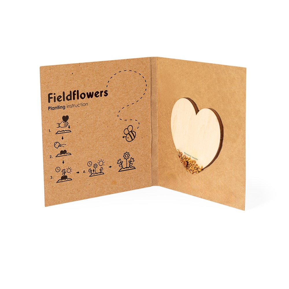 Zaadhart van natuurlijk hout, met zaden van wilde bloemen, klaar om te planten. Gepresenteerd in een elegante gerecyclede kartonnen kaart, met plantinstructies en een groot markeeroppervlak.
