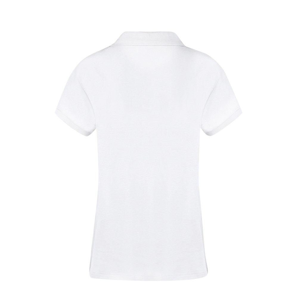 Dames piqué poloshirt in het wit. Van 100% katoen, materiaal 220 g/m2. Met twee bijpassende knoopsluitingen en zijopeningen aan de zoom. Gemakkelijk verwijderbaar label. Maten S, M, L, XL, XXL, 3XL.