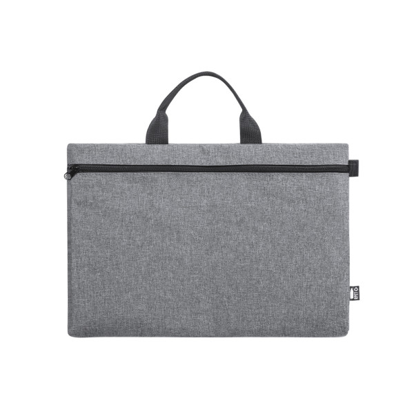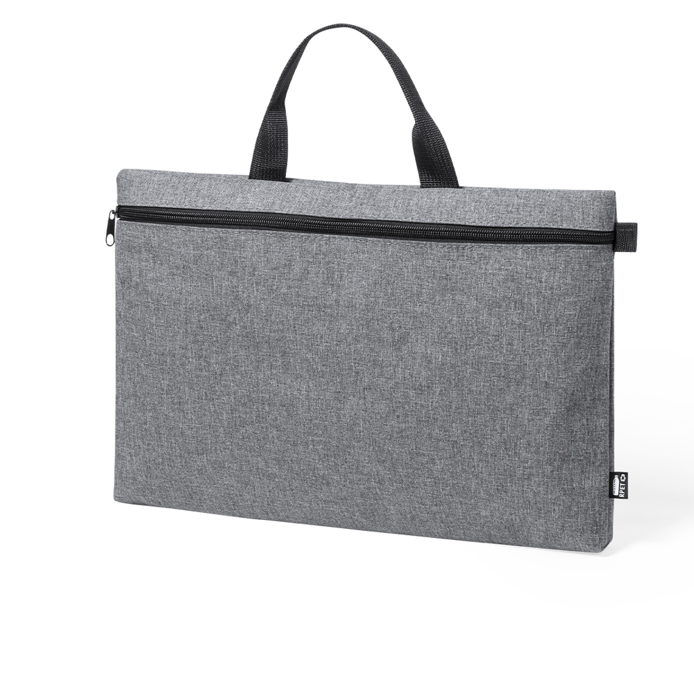 Documenthouder van natuurlijn en in resistent 600D RPET gemêleerd effect, gemaakt van gerecycleerd plastic om het hergebruik van plastic afval te bevorderen en bij te dragen tot de duurzaamheid van de planeet. Zwarte details en hoofdvak met rits. Duurzame handgrepen in bijpassende kleur en RPET-onderscheidingsteken op het etiket aan de buitenkant.