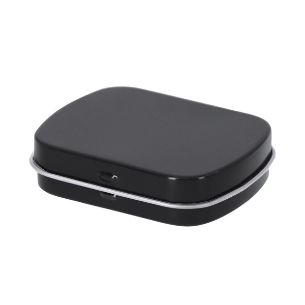 Dispenser van suikervrije muntjes van 23 g. Gepresenteerd in een metalen doos met scharnierend deksel.