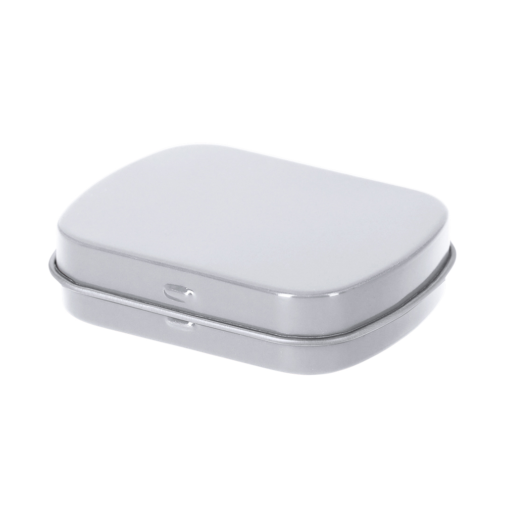Dispenser van suikervrije muntjes van 23 g. Gepresenteerd in een metalen doos met scharnierend deksel.