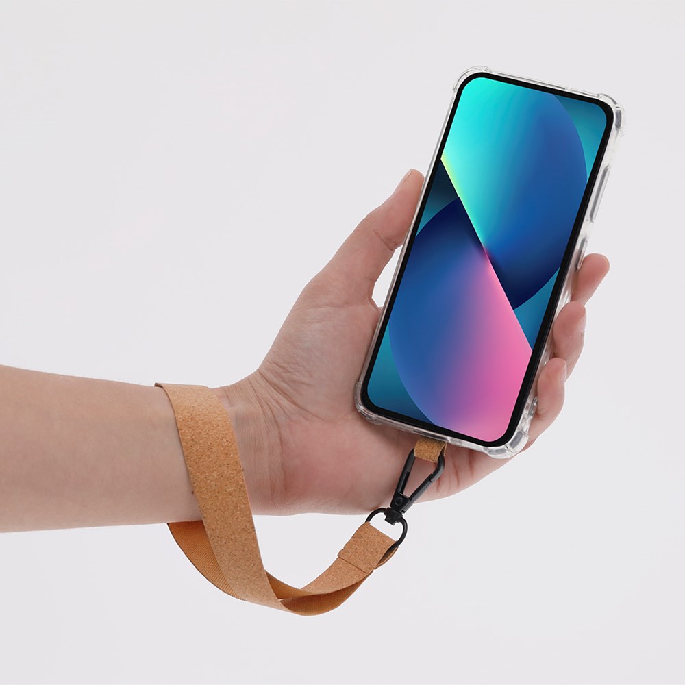 Smartphone armbandhouder gemaakt van kurk. Met bijpassende draagriem en zwarte metalen draaibare haak.Gemaakt met plantaardige elementen om het gebruik van natuurlijke grondstoffen te bevorderen en vervuilende emissies te verminderen.