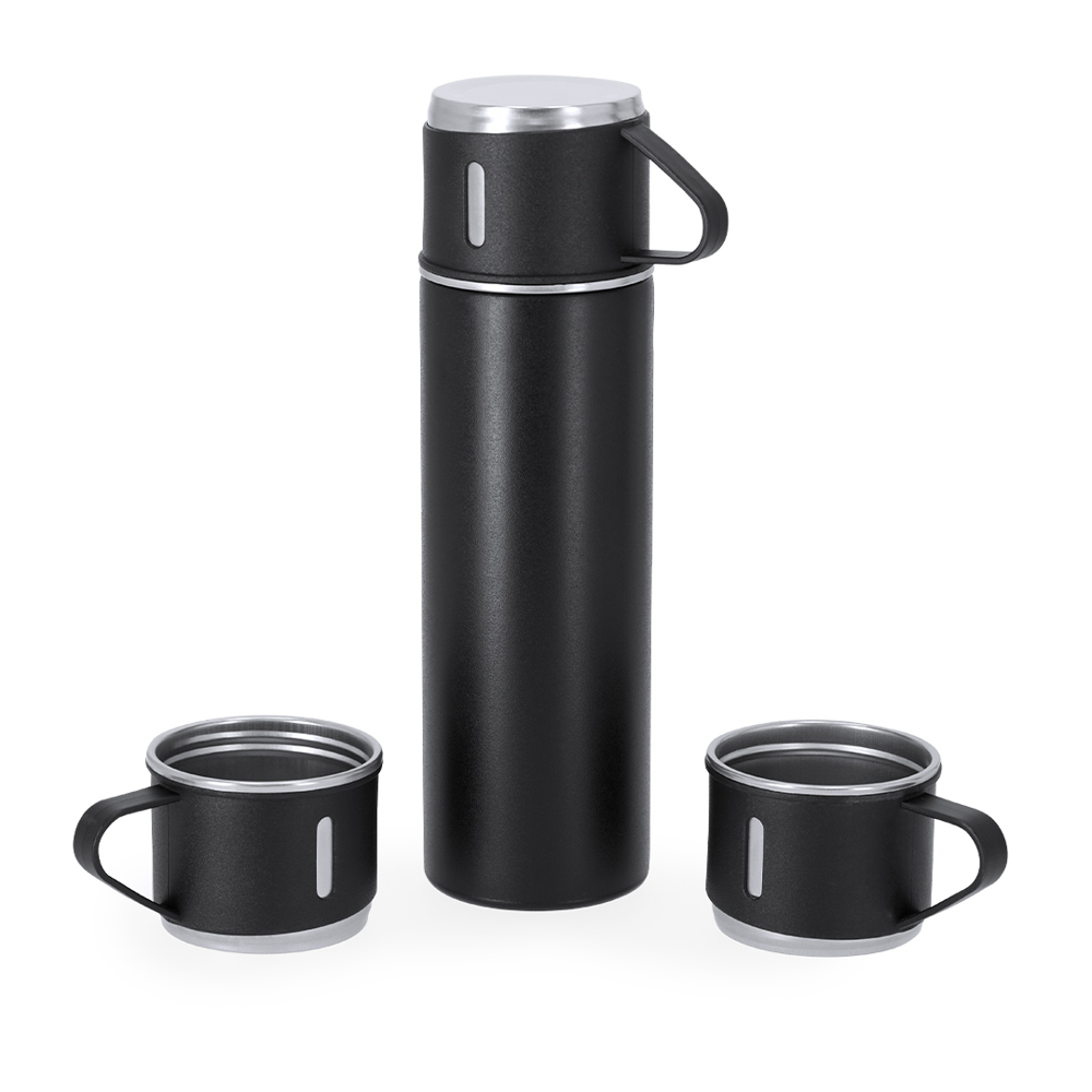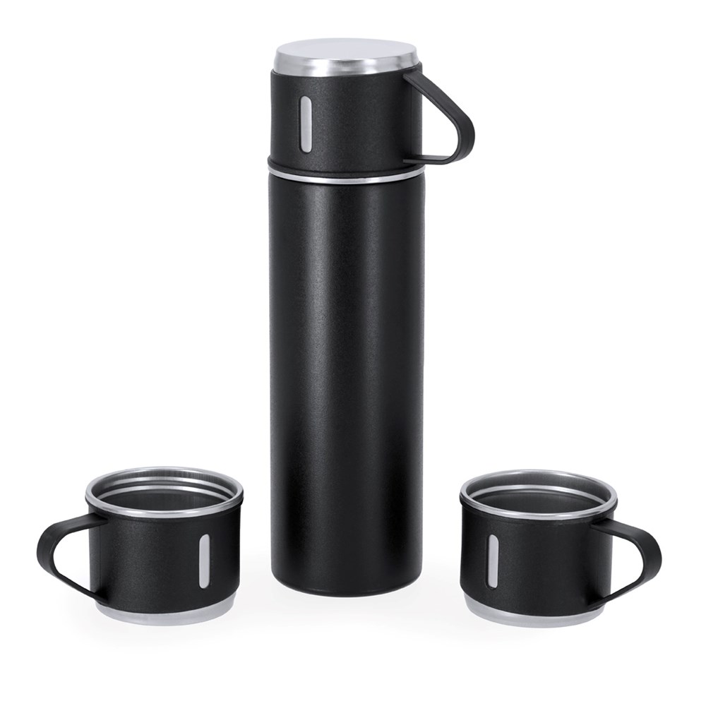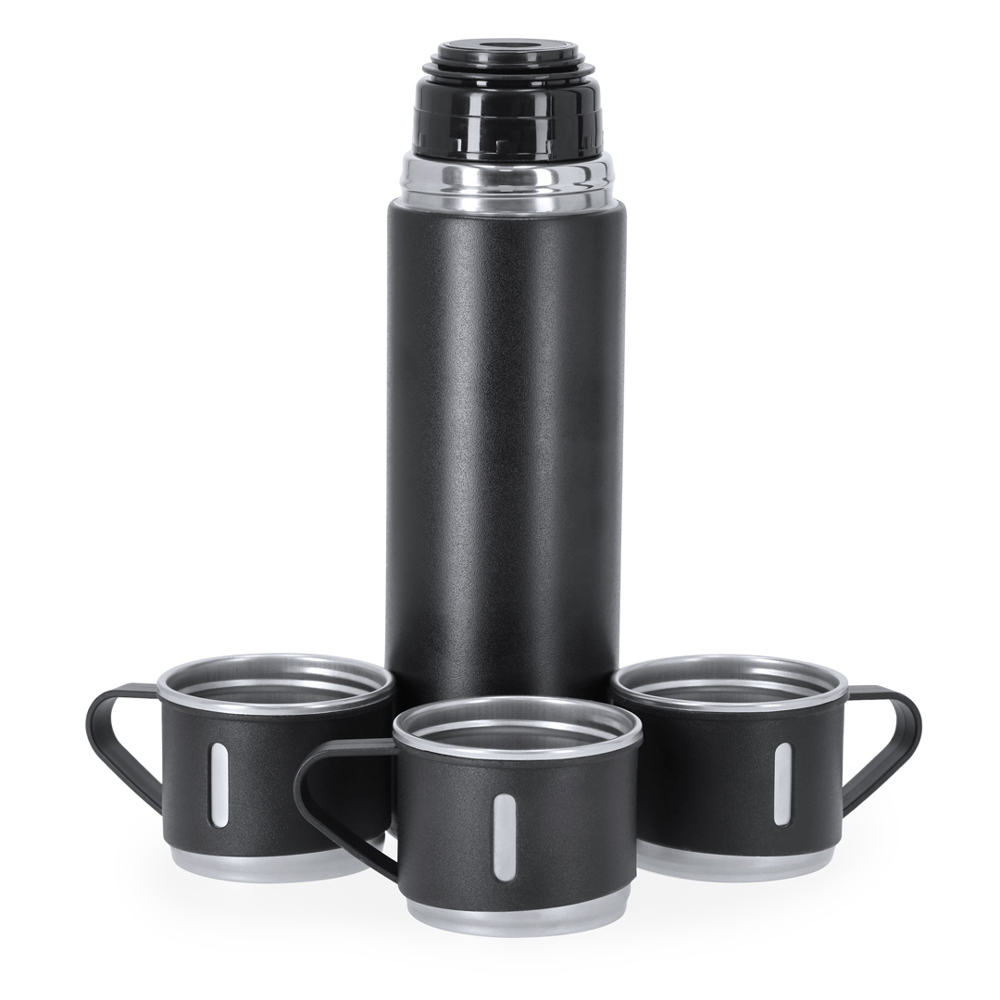 Set van thermosfles en 3 bekers gemaakt van roestvrij staal. Dubbelwandige thermosfles met een capaciteit van 420 ml, voor een betere en langdurige temperatuurbehoud, met veilige dispenser. 140 ml schroefbare bekers in een elegant zwart design, ideaal voor het genieten van een warm of koud drankje, altijd en overal. Gepresenteerd in een elegant zwart etui.