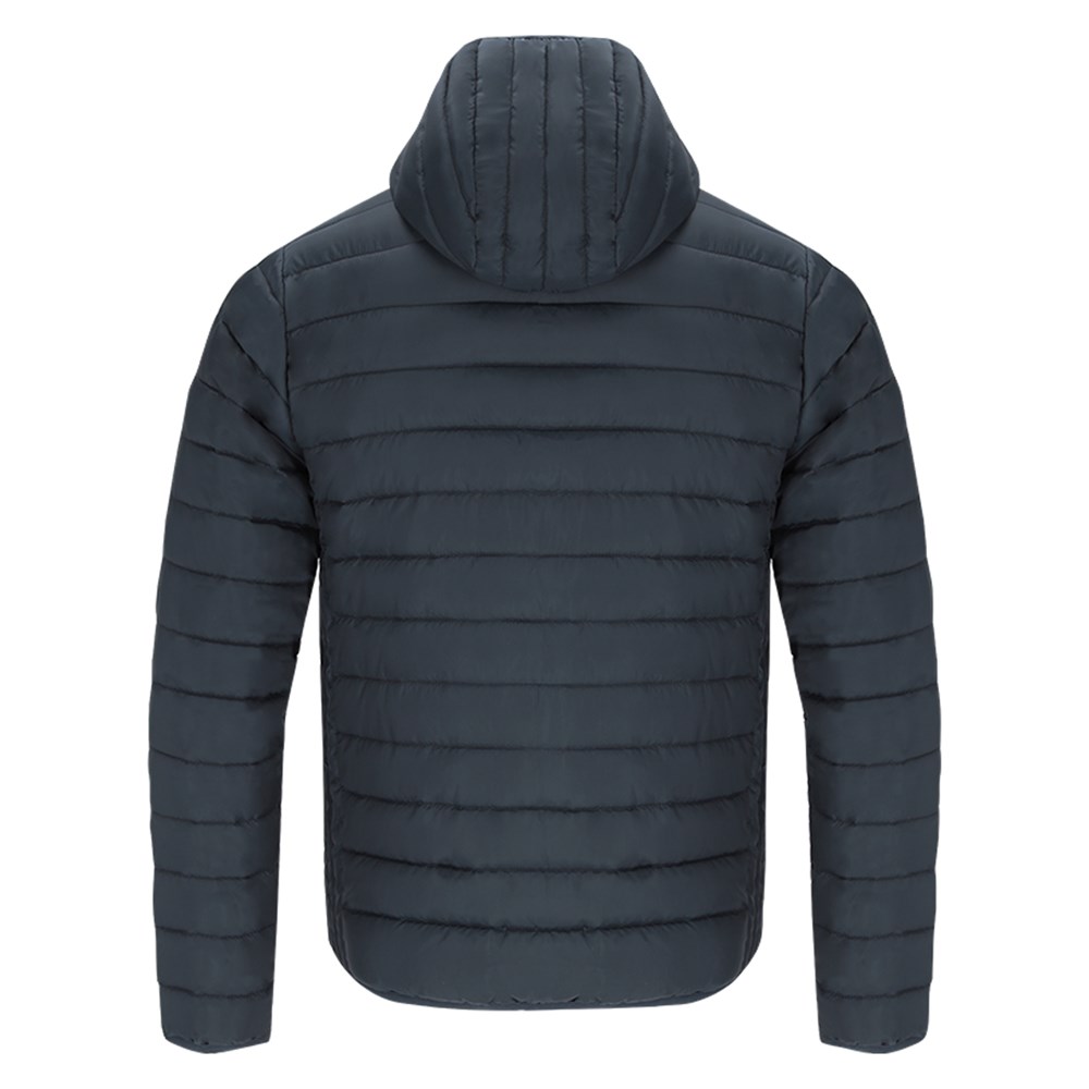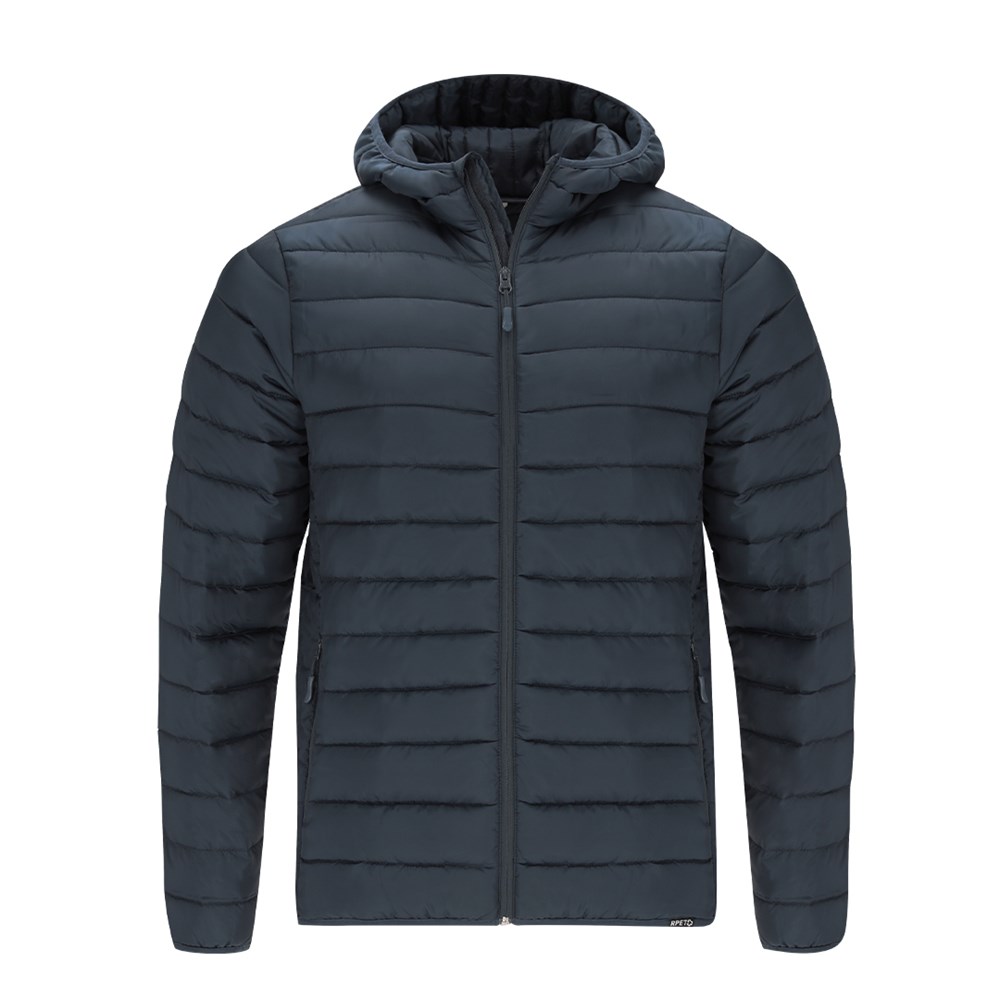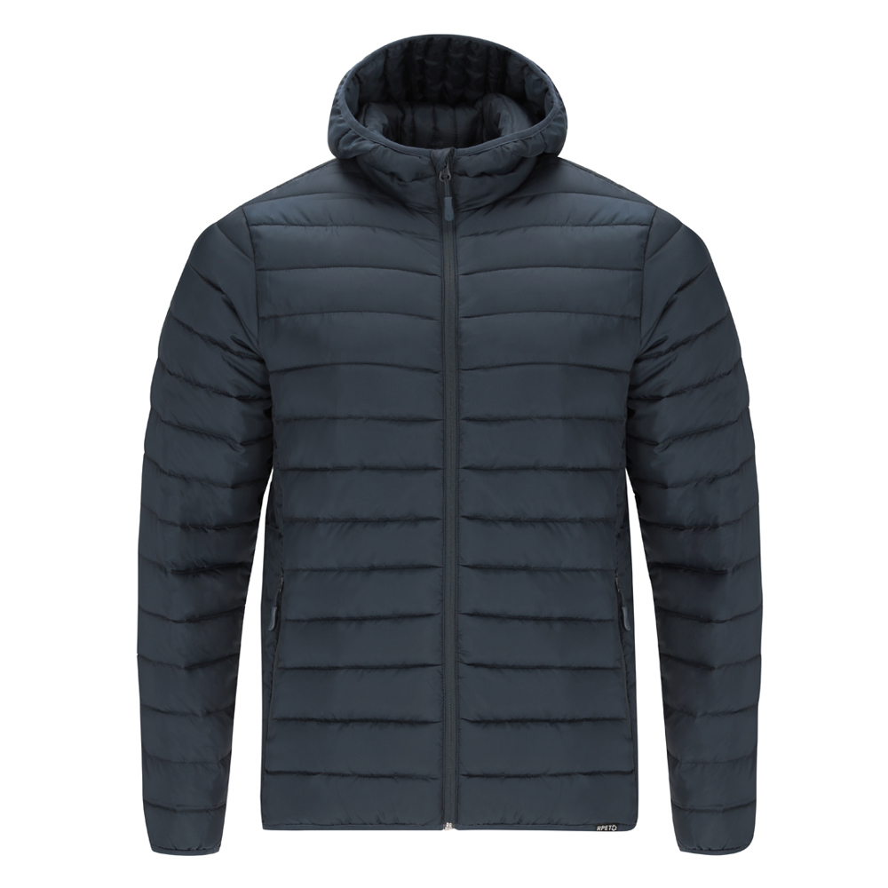 RPET uniseks jack met capuchon. Van extra licht materiaal met padding met een veereffect en zachte voering, waterdicht en winddicht. Manchetten, taille en capuchon met bijpassend elastisch biesje. Omgekeerde ritssluiting met bijpassende ritstrekker en kinbeschermer. Inclusief 2 buitenzakken aan de zijkant met bijpassende ritsen en treklipjes, en 2 binnenzakken. RPET-label op het biesje en praktische draagtas met verstelbaar trekkoord.