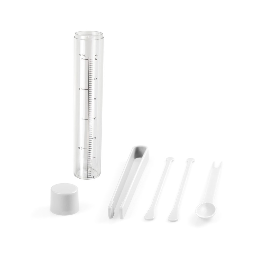 Cocktail set met 5 accecoires in 4 kleuren, inclusief 60 ml beker, een lepel, maatbeker van 60ml en 2 roerstaven.