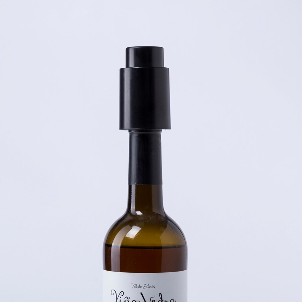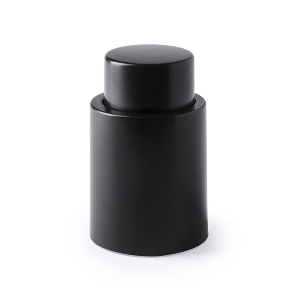 Vacuümdeksel voor wijnflessen in een elegante, zwarte kleurstelling. Bovenzijde van het deksel voor tampondruk. Gepresenteerd in een individuele doos.