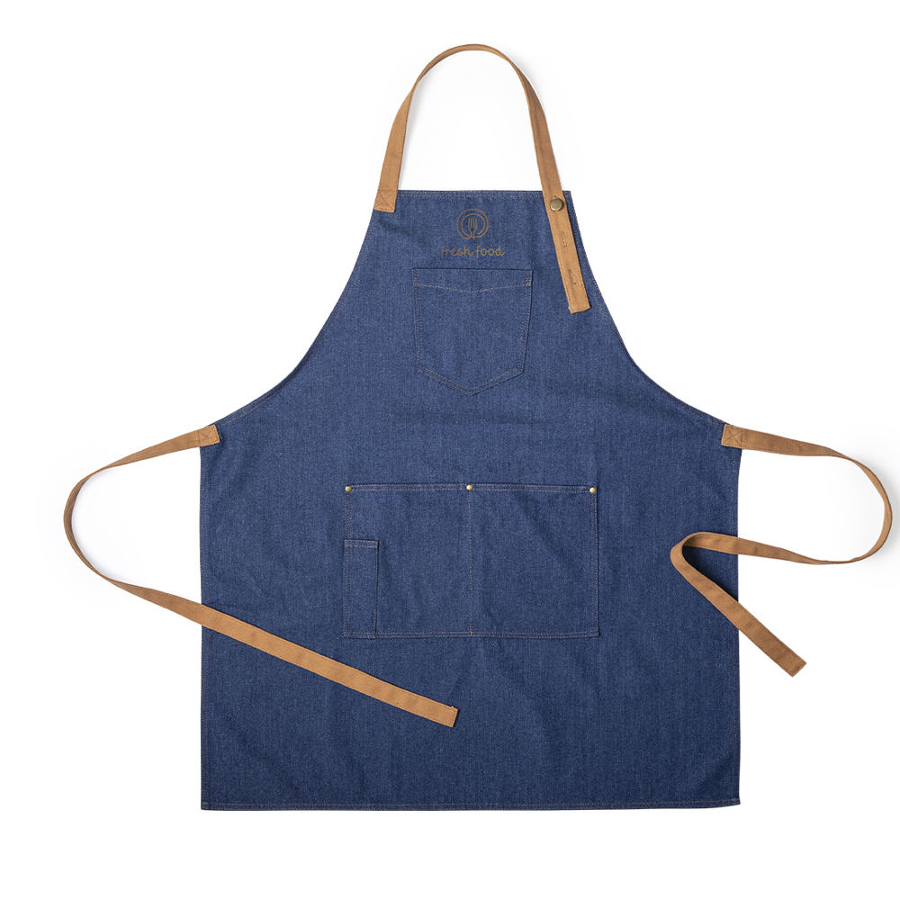 Hoogwaardig schort van zware stof met denim afwerking. Aansluitend tot onder de knie, met met knopen verstelbare nekband en versterkte, bruine taillebanden. Meerdere zakken voor handig opbergen en toegang tot keukengerei. Versterkte stiksels en metalen klinknagels.