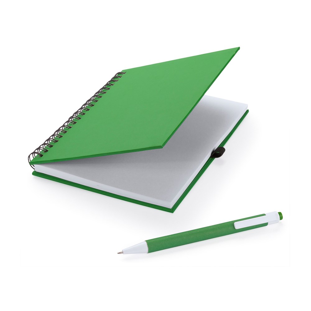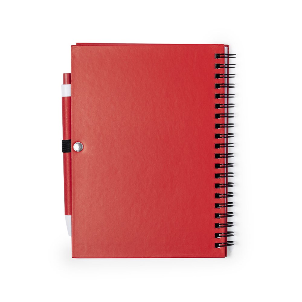 Notitieboek en pennenset. Ring notitieboekje met zacht aanvoelende kaft van gerecycled karton, en bijpassende pen. Bevat 70 effen pagina's met penhouder. Verkrijgbaar in een verschillende kleuren.