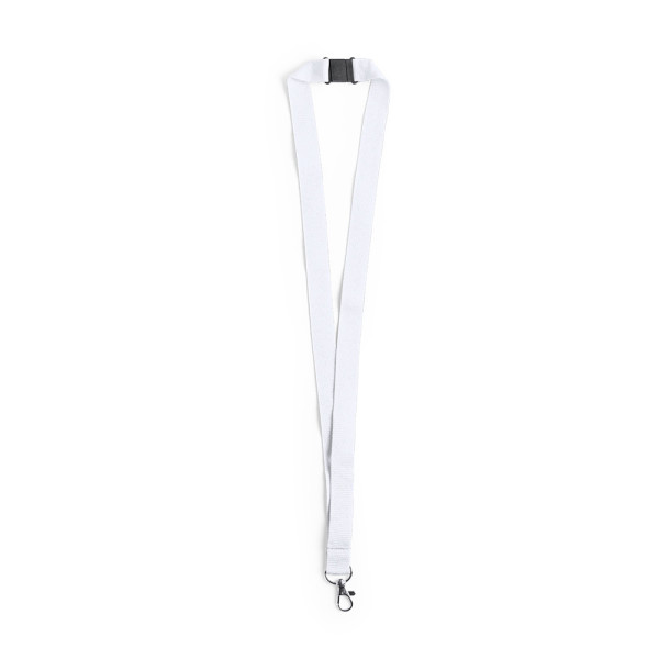 Keycord van polyester, met veiligheidssluiting in de nek, met karabijnhaak. Verkrijgbaar in verschillende kleuren.