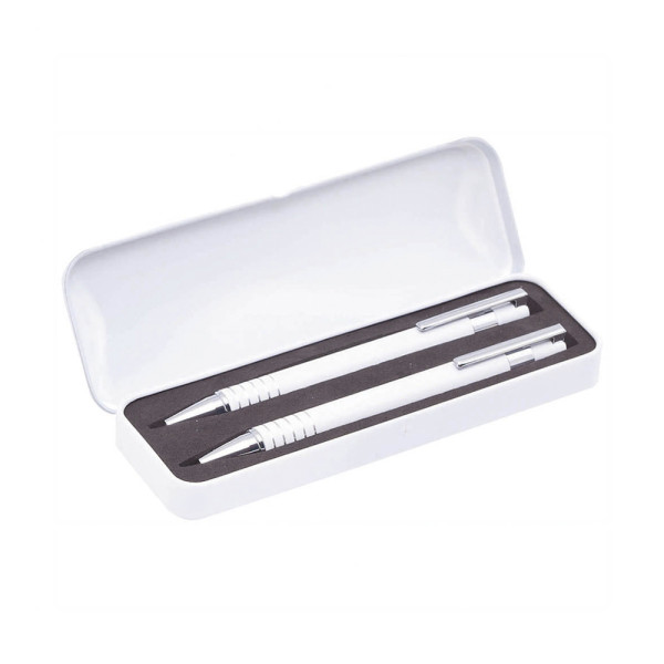 Set van balpen met push-up mechanisme en vulpotlood in een origineel tweekleurig ontwerp. Metalen behuizing in een gladde afwerking in verschillende kleuren en zilverkleurige accecoires. Met geringde grip en gepresenteerd in een stevig metalen doos met zacht schuim aan de binnenkant. Jumbo inktpatroon balpen, met blauwe inkt en 0.7 mm vulling inbegrepen.