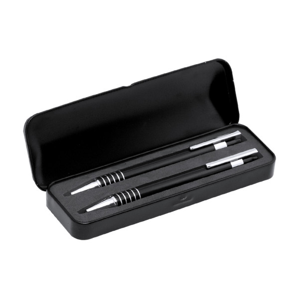 Set van balpen met push-up mechanisme en vulpotlood in een origineel tweekleurig ontwerp. Metalen behuizing in een gladde afwerking in verschillende kleuren en zilverkleurige accecoires. Met geringde grip en gepresenteerd in een stevig metalen doos met zacht schuim aan de binnenkant. Jumbo inktpatroon balpen, met blauwe inkt en 0.7 mm vulling inbegrepen.