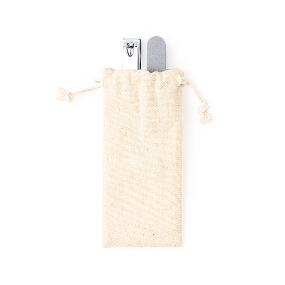 Manicure set met nagelknipper en vijl. Gepresenteerd in individueel zakje van natuurlijk katoen met koordsluiting.